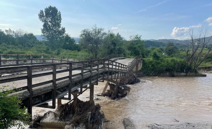 Kastamonu’nun Araç ilçesinde kuvvetli sağanak yağış sonrasında debisi yükselen dere üzerindeki köprü kullanılamaz hale geldi.