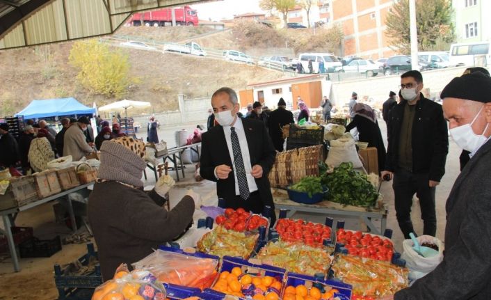 Tosya’da Covid-19 denetimlerini sürdüren Kaymakam Deniz Pişkin, sebze pazarında alınan tedbirleri denetledi.