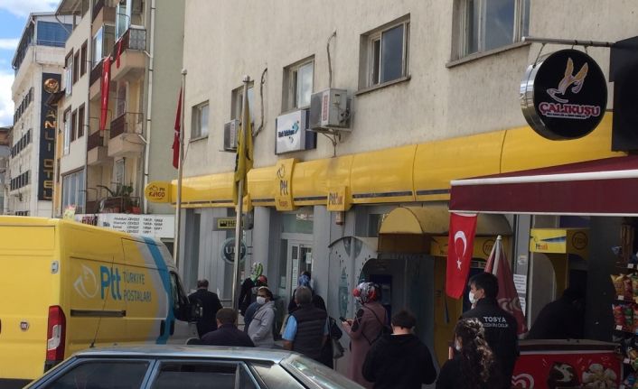 Yeni tip korona virüs covid-19 salgın hastalığı nedeniyle kışa çalışma ödeneği ve işsizlik maaşı ödemelerinin başlaması sonrasında Tosya PTT Şubesi de maaş ödemeleri devam ediyor. Ödemeler nedeniyle salgın yoğun mesaisi ile çalışan şubeye gelen vatandaşlar, PTT önünde uzun kuyruk oluşturarak sıranın kendisine gelmesini bekliyor. Korona virüs tedbirleri kapsamında maskelerini takan vatandaşlar, sosyal mesafe kurallarına da dikkat ediyorlar. Vatandaşların tek tek içeriye alındığı şubede maskesiz girişe izin verilmezken, vatandaşlar ateşi ölçüldükten sonra işlem yapılacak gişeye yönlendiriliyor. İşlemini tamamlayan vatandaşlar tekrar ateşi ölçüldükten sonra dışarı çıkmasına izin veriliyor.