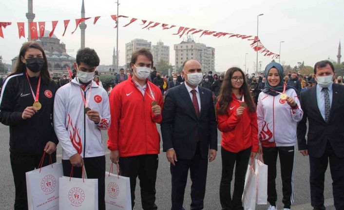 2021 Dünya Büyükler Kick Boks Şampiyonası’nda dünya ikincisi olan Hayriye Türksoy Hançer’in de ödüllendirildiği bayram etkinliğinde toplanda 18 sporcuya ödül verildi. 29 Ekim Cumhuriyet Bayramı, dün Kayseri’de büyük bir coşkuyla kutlandı. Kayseri Cumhuriyet Meydanı’nda yapılan törende, 2021 yılında çeşitli spor branşlarında dereceye giren sporcular ödüllendirildi. Sporculara ödülleri, Kayseri Valisi Şehmus Günaydın, Kayseri Büyükşehir Belediye Başkanı Memduh Büyükkılıç ve Garnizon Komutanı Tuğgeneral Vedat Öncel tarafından takdim edildi. Ödül alan sporcular şu şekilde;