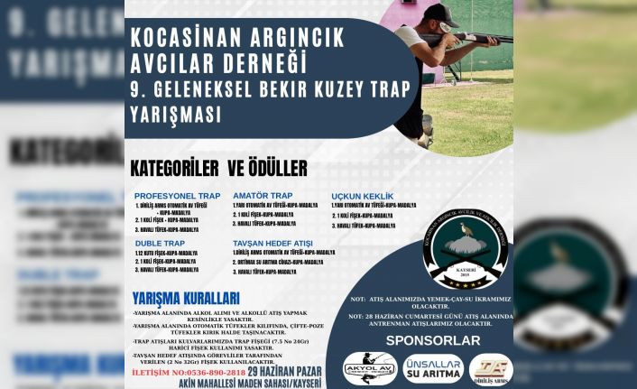 Kocasinan Argıncık Avcılık Atıcılık Derneği 9. Geleneksel Bekir Kuzey Trap yarışmaları 28-29 Haziran tarihlerinde 5 farklı kategoride gerçekleştirilecek.