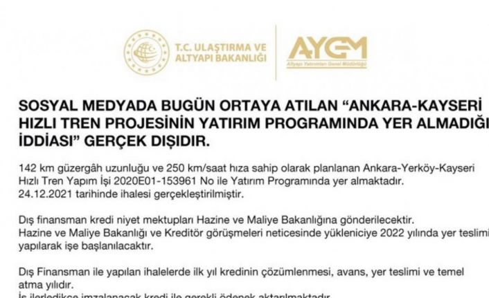 “Sosyal medyada bugün ortaya atılan "Ankara-Kayseri Hızlı Tren Projesi’nin yatırım programında yer almadığı iddiası" gerçek dışıdır. 142 km güzergah uzunluğu ve 250 km/saat hıza sahip olarak planlanan Ankara-Yerköy-Kayseri hızlı tren işi 2020E01-153961 no ile yatırım programında yer almaktadır. 24.12.2021 tarihinde ihalesi gerçekleştirilmiştir. Dış finansman kredi niyet mektupları Hazine ve Maliye Bakanlığı’na gönderilecektir. Hazine ve Maliye Bakanlığı ve kreditör görüşmeleri neticesinde yükleniciye 2022 yılında yer teslimi yapılarak işe başlanılacaktır. Dış finansman ile yapılan ihalelerde ilk yıl kredinin çözümlenmesi, avans, yer teslimi ve temel atma yılıdır. İş ilerledikçe imzalanacak kredi ile gerekli ödenek aktarılmaktadır. Ankara-Kayseri Hızlı Tren Projesi’ni 2025 yılında hizmete açmayı hedefliyoruz.”