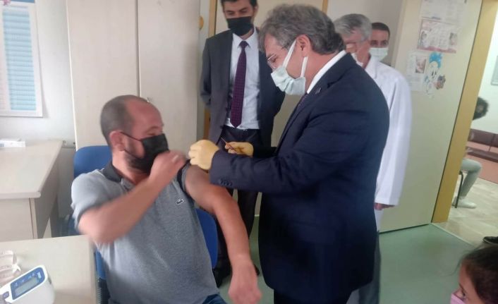 Kayseri’de aşı için aile sağlığı merkezine gelen bir vatandaşın aşısını İl Sağlık Müdürü Doç. Dr. Ali Ramazan Benli yaptı.