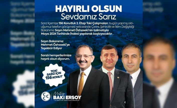 “Hayırlı Olsun Sevdamız Sarız! Sarız İlçemizde 156 Konutluk 2. Etap TOKİ Çalışmaları, bugün yapmış olduğumuz telefon görüşmesi neticesinde Çevre, Şehircilik ve İklim Değişikliği Bakanımız Sayın Mehmet Özhaseki’nin talimatıyla Mayıs 2024 Tarihinde İhalesi yapılarak başlayacaktır. Sayın Bakanımız Mehmet Özhaseki Beyefendi’ye teşekkür ediyor, Sarızlı hemşerilerimize hayırlı olsun diyorum.”