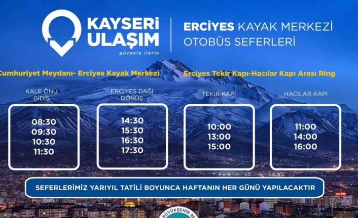 Başkan Büyükkılıç, öğrencilerin yarıyıl tatiline girdiğini hatırlatarak, “Yarıyıl tatili boyunca Erciyes seferlerimiz haftanın her günü hizmet verecektir. Cumhuriyet Meydanı’ndan Erciyes Kayak Merkezi’ne, kale önünden gidişler, saat 8.30, 9.30, 10.30 ve 11.30 olarak belirlenirken, Erciyes Dağı’ndan dönüşler saat 14.30, 15.30, 16.30 ve 17.30 olarak düzenlendi” diye konuştu. Erciyes Tekir Kapı ile Hacılar Kapı arasında 10.00 ila 16.00 saatleri arasında ring seferleri gerçekleşeceğini de vurgulayan Büyükkılıç, “Kış turizminde Erciyes ülkemizin en önemli merkezlerinin başında yer alıyor. Kayserimizin sembolü, dünyanın ve Türkiye’nin en önemli kayak merkezlerinden olan Erciyes, yine misafirlerinin gözdesi olmaya devam ediyor” ifadelerini kullandı.