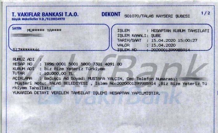 Geçtiğimiz günlerde Cumhurbaşkanı Recep Tayyip Erdoğan’ın 7 maaşını bağışlayarak başlattığı ’Biz Bize Yeteriz Türkiyem’ kampanyasına, Talas Belediye Başkanı Mustafa Yalçın da 10 bin TL destekte bulundu. Başkan Yalçın sosyal medya hesabından yaptığı bağışın dekontunu paylaştı.