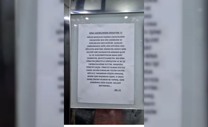 Kayseri’de bir bina yöneticisi, bina sakinlerine isyanını bina içerisindeki cama astığı kağıtla gösterdi. Kağıda yazdıklarıyla adeta içini döken bina yöneticisi, görevini bırakacağını ve artık binanın işleriyle uğraşmaktan sıkıldığını söyledi. Yönetici, güldüren isyanını kağıda döktüğü şu sözlerle ifade etti: