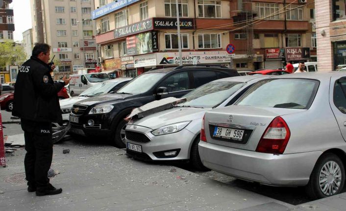 Kayseri’de etkili olan fırtına nedeniyle binalardan kopan parçalar araçların üzerine düştü. Araçlarda büyük çapta maddi hasar meydana gelirken o anlar ise güvenlik kameralarınca kaydedildi.