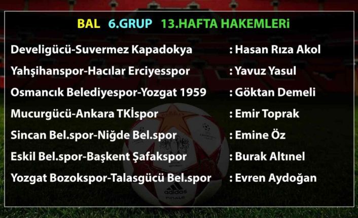 Bölgesel Amatör Lig 6.Grup’ta oynanacak 13.hafta maçlarını yönetecek hakemler ise şu şekilde: