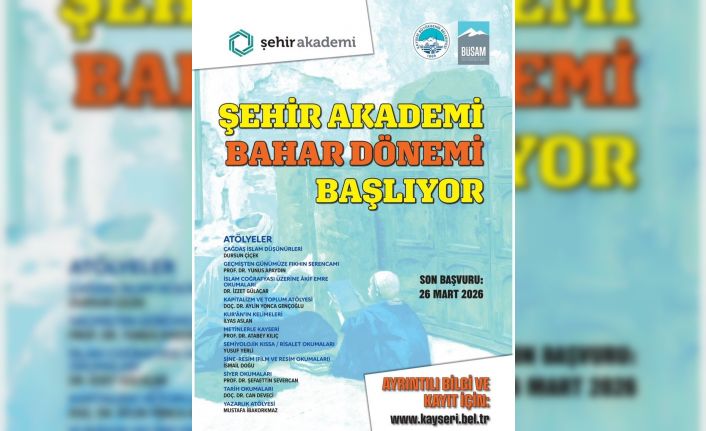 Kayseri Büyükşehir Belediyesi öncülüğünde şehrin düşünce ve fikir hayatına katkı sağlamak amacıyla faaliyetlerini yürüten BÜSAM’ın, Şehir Akademi Bahar Dönemi başlıyor. Çeşitli atölye ve seminerlerin yer aldığı akademiye kayıtlar için son tarih 26 Mart 2026 olarak belirlendi.