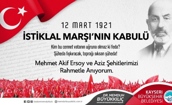 Kayseri Büyükşehir Belediye Başkanı Dr. Memduh Büyükkılıç, 12 Mart İstiklal Marşı’nın kabulü ve Mehmet Akif Ersoy’u Anma Günü dolayısıyla bir mesaj yayımladı. İstiklal Marşı’nın, Türk Milleti’nin milli birliğinin, beraberliğinin ve bağımsızlığının sembolü olduğunu ifade eden Başkan Büyükkılıç, “İstiklal Marşı’mızın kabulünün 100. yıldönümünde Mehmet Akif Ersoy’u ve vatanı uğruna canını feda eden şehitlerimizi rahmetle anıyorum” dedi.