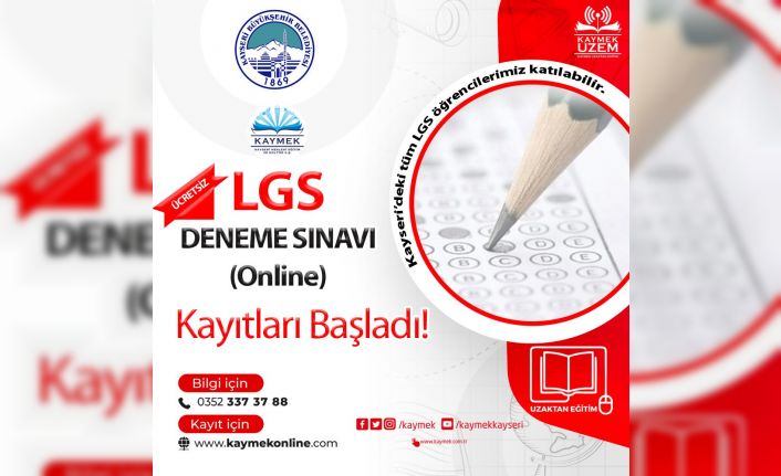 LGS-YKS, KPSS ve Sanat kursları ile kurs çeşitliliğine önem gösteren Büyükşehir Belediyesi KAYMEK, bu minvalde vatandaşlardan gelen yoğun talepler doğrultusunda KAYMEK bünyesinde ilk kez LGS Deneme Sınavı gerçekleştirecek. Gençler tarafından yoğun ilgi gören online LGS Deneme sınavının kayıtları 4 Kasım Cuma günü başladı. KAYMEK UZEM ile gerçekleştirecek olan LGS Deneme sınavı 13 Kasım Pazar günü 2 oturum şeklinde online olarak yapılacak.