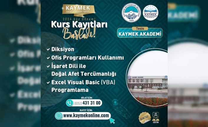 KAYSERİ BÜYÜKŞEHİR BELEDİYESİ BÜNYESİNDE MESLEKİ EĞİTİM, ÖSYM VE MEB SINAVLARINA HAZIRLIK EĞİTİMİ, KİŞİSEL GELİŞİM, KÜLTÜR SANAT FAALİYETLERİ GİBİ ÇOK GENİŞ BİR YELPAZEDE HİZMETLERİNİ YÜRÜTEN KAYMEK A.Ş. ÇEŞİTLİ BRANŞLARDAKİ KURSLARINA YENİ KAYITLAR ALMAYA DEVAM EDİYOR.