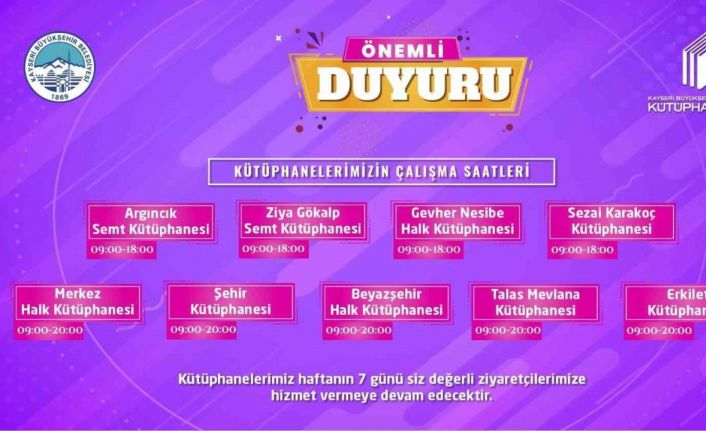 Kayseri Büyükşehir Belediyesi’ne ait kütüphanelerde çalışma saatleri yeniden düzenlendi. Belediye bağlı kütüphanelerde haftanın 7 günü hizmet vermeye devam ediyor.