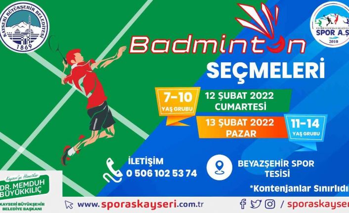 Kayseri Büyükşehir Belediyesi bünyesindeki Spor A.Ş. raket ve bir tür tüylü topla oynanan tenis benzeri oyun olan Badminton seçmeleri 12-13 Şubat’ta yapılacak.