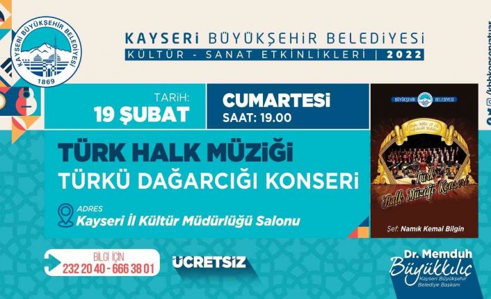 Büyükşehir Belediye Başkanı Dr. Memduh Büyükkılıç’ın yerel yönetim hizmetlerinin yanı sıra kültür sanat etkinliklerine verdiği önem kapsamında Kayseri Büyükşehir Belediyesi Konservatuarı tarafından ücretsiz ‘Türk Halk Müziği Türkü Dağarcığı Konseri’ düzenlenecek.