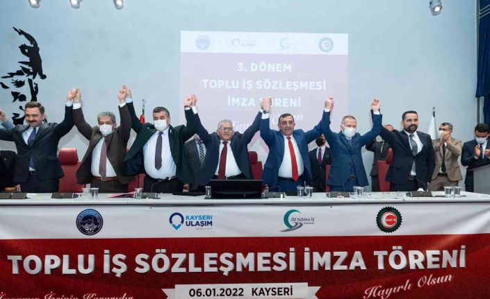 Kayseri Büyükşehir Belediye Başkanı Dr. Memduh Büyükkılıç, Ulaşım A.Ş.’de bin 49 çalışanı kapsayan toplu iş sözleşmesine imza attı. Başkan Büyükkılıç, bayram havasında geçen toplu iş sözleşmesi imza töreninde “Biz büyük ve huzurlu bir aileyiz” vurgusu yaparken, çalışanların bayram ikramiyesini 500 TL daha artırdı. Topu iş sözleşmesine göre, ikramiye ve sosyal haklar ile birlikte en düşük ücret brüt 6 bin 604 TL oldu.