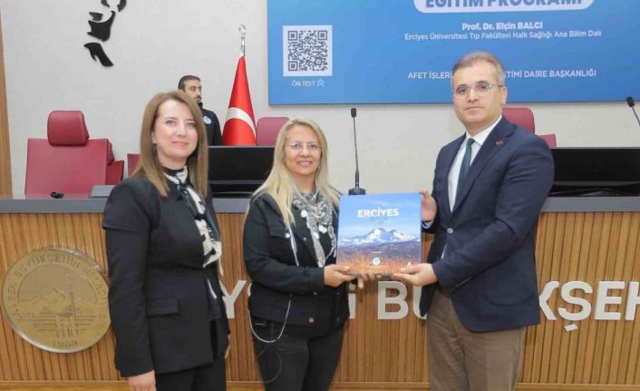 Eğitim programının sonunda Büyükşehir Belediyesi Genel Sekreter Yardımcısı Ufuk Sekmen Erciyes Üniversitesi Tıp Fakültesi Hastaneleri İş Sağlığı Güvenliği Birim Sorumlusu ve İşyeri Hekimi Prof. Dr. Elçin Balcı’ya Büyükşehir’in kültür yayınlarından Erciyes Dağı kitabını hediye etti.