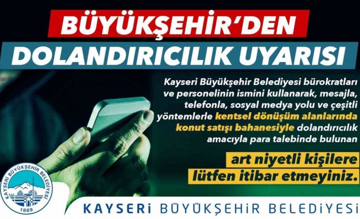 Kayseri Büyükşehir Belediyesi tarafından belediye bürokratları ve personel isimlerinin kullanılarak kentsel dönüşüm alanlarında konut satışı bahanesiyle dolandırıcılık yapıldığının belirlendiği açıklanarak, bu tarz kişi ya da kişilere karşı dikkatli olunması uyarısında bulunuldu.