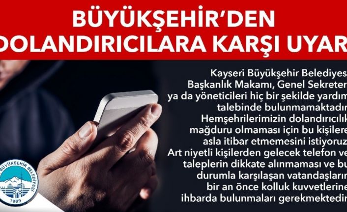 Kayseri Büyükşehir Belediyesi, belediye yöneticilerinin isimlerini kullanarak dolandırıcılık yapmak isteyen kişi ya da kişilerin bulunduğunun anlaşıldığını açıklayarak, bu tür aramalara karşı uyarıda bulundu.