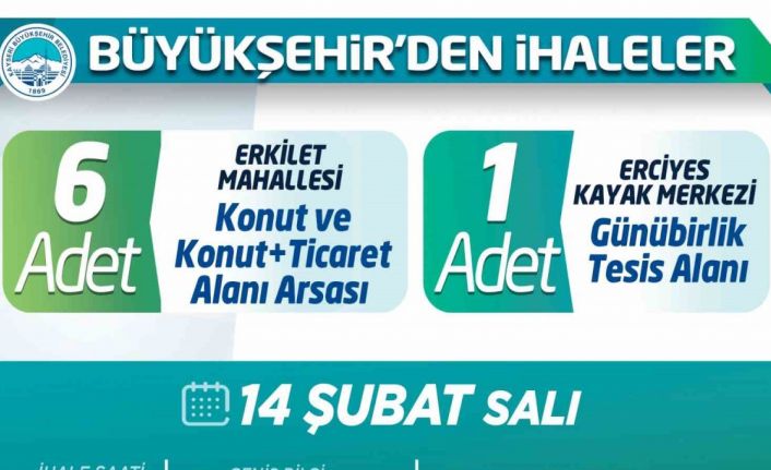 Mülkiyeti Kayseri Büyükşehir Belediyesi’ne ait olan, Kocasinan Erkilet Mahallesi’nde bulunan 6 adet arsa ile Erciyes Mahallesi’nde (Erciyes Kayak Merkezi) bulunan 1 adet günübirlik tesis alanı arsası 2886 sayılı Devlet İhale Kanununun 37. maddesi gereğince yapılacak Kapalı Teklif Usulü ihale ile satış gerçekleştirilecek.