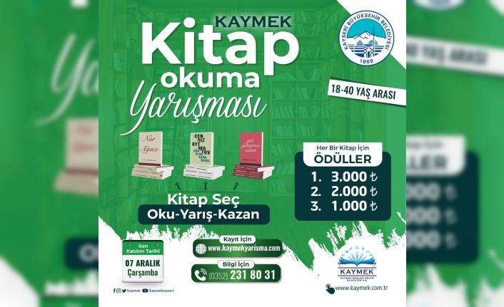 Kayseri Büyükşehir Belediyesi bünyesinde faaliyetlerini yürüten Kayseri Mesleki Eğitim ve Kültür A.Ş. (KAYMEK) vatandaşlara yönelik ’Kitap Seç, Oku, Yarış, Kazan’ sloganıyla ödüllü kitap okuma yarışması düzenleyecek.