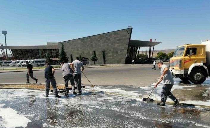 Kayseri Büyükşehir Belediyesi ekipleri tarafından Şehirlerarası Otobüs Terminali çevresinde kapsamlı yıkama ve temizlik çalışması yapıldı.