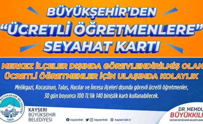 Kayseri Büyükşehir Belediyesi UKOME Kurulu, merkez ilçeler dışında görevlendirilmiş olan ücretli öğretmenler için seyahat kartı verilmesine karar verdi. Ücretli öğretmenler, 30 gün boyunca 140 binişlik ücreti 100 TL olarak belirlenen kartı kullanacak.