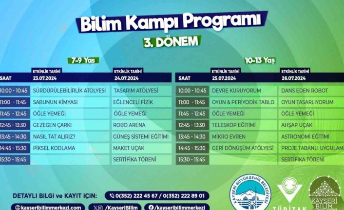 Vatandaşlar, Kayser Bilim Merkezi Yaz Bilim Kampı hakkında detaylı bilgiye 0 352 222 45 67 ve 0 352 222 89 01 numaralı telefonlar üzerinden erişebilecek.