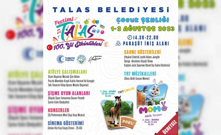 1-2 Ağustos tarihlerinde Talas Paraşüt İniş Alanı’nda gerçekleştirilecek şenlikte çocuklar ve aileleri dolu dolu 2 gün geçirecek. Atölye çalışmalarından sahne gösterilerine, sinema gösterimlerinden konserler ve TRT müzikallerine kadar birçok aktivitenin çocuklarla buluşacağı organizasyonda ayrıca şişme oyun alanındaki birbirinden keyifli oyunlar çocukları bekliyor olacak. Tamamı ücretsiz olacak etkinlikler, 1 Ağustos Salı ve 2 Ağustos Çarşamba günü saat 14.30’da başlayacak ve 22.00’ye kadar devam edecek. Konuya ilişkin bir değerlendirme yapan Talas Belediye Başkanı Mustafa Yalçın, cumhuriyetin 100 yılını kutladıklarına dikkat çekerek “Cumhuriyetimiz 100 yaşında ve biz bunun gururunu yaşıyoruz. Bununla birlikte 100. yılı anlamlı kılmak ve coşkulu şekilde kutlamak amacıyla birçok etkinlik ve açılış planladık. Bu çerçevede birbirinden önemli tesis ve yatırımları hizmete açacağız. Bununla birlikte her yaşa ve her kesime hitap eden organizasyonlarımız olacak. 1 ve 2 Ağustos’ta çocuklarımız için iki günlük bir şenlik düzenliyoruz. Hem gönüllerince eğlenecekler hem de bilgi sahibi olacaklar. Tüm çocuklarımızı ve ailelerini, Paraşüt İniş Alanına bekliyoruz” dedi.