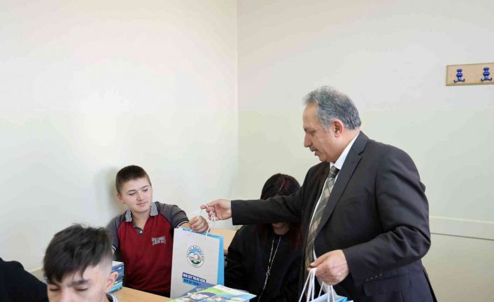Konuşmaların ardından Başkan Yalçın ve Kaymakam Dönmez, sınıfları dolaşarak öğrencilere çeşitli yayınlardan ve ders aletlerinden oluşan çanta hediye etti.
