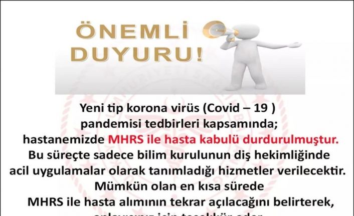 Kayseri Nimet Bayraktar Ağız Ve Diş Sağlığı Hastanesi tarafından yapılan duyuruda, "Yeni tıp koronavirüs pandemisi tedbirleri kapsamında hastanemizde MHRS ile hasta kabulü durdurulmuştur. Bu süreçte sadece Bilim Kurulu’nun diş hekimliğinde acil uygulamalar olarak tanımladığı hizmetler verilecektir. Mümkün olan en kısa sürede MHRS ile hasta alımının tekrar açılacağını belirterek, anlayışınız için teşekkür ederiz, sağlıklı günler dileriz" ifadesinde bulunuldu.