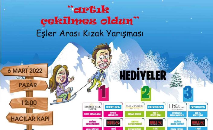 Erciyes Kayak Merkezi Hacılar Kapı bölgesindeki kızak pistinde, 6 Mart Pazar saat 12.00’de ücretsiz gerçekleştirilecek etkinliğe katılmak için online kayıt yapma zorunluluğu bulunuyor. Çiftlerin birbirini belirli bir parkurda bitiş noktasına kadar kızakla çekeceği etkinlik sonunda dereceye giren çiftler, katılımcıları teşvik etmek ve etkinliği daha keyifli hale getirmek için koyulan ödülleri kazanma hakkı elde ediyor. ‘Artık Çekilmez Oldun Eşler Arası Kızak Yarışması’na katılmak isteyen çiftlerin, www.artikcekilmezoldun.com internet adresinden kayıt yapmaları gerekiyor.