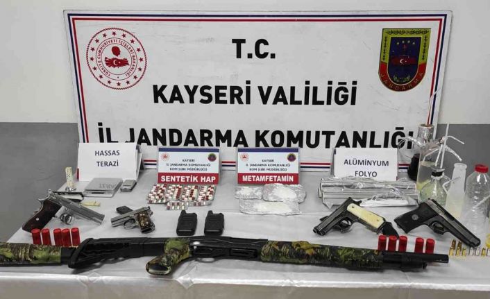 Edinilen bilgiye göre Kayseri il jandarma Komutanlığı ekiplerince ’uyuşturucu ve uyarıcı madde ticareti’ ve ’Silah Kaçakçılığı’ suçunu işleyen şahısların tespitine yönelik çalışma yapıldı. Yapılan çalışmalarda Gültepe ve Talatpaşa Mahallesi’nde B.D. ve A.İ.’ya ait evlerde ve uyuşturucu ticareti yaptıklarıı belirlenen üç ayrı adreste operasyon düzenlendi. Yapılan aramalarda çeşitli yerlere zulalanmış vaziyette 4 adet çeşitli markalarda ve çaplarda ruhsatsız tabanca, 1 adet ruhsatsız av tüfeği, 8 adet 9 mm. tabanca fişeği, 10 adet fişek, 80 gram metamfetamin uyuşturucu madde, 70 adet uyuşturucu hap, 2 adet hassas terazi, 2 adet haberleşme için kullandıları el telsizi, 6 adet kullanma aparatı ve 3 adet alüminyum folyo ele geçirildi.