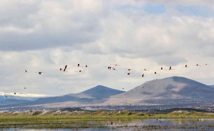 Bahar aylarının gelmesi ile birlikte göç etmeye başlayan Flamingolar, Kayseri’nin Melikgazi ilçesinde bulunan Hürmetçi Sazlığı’na geldi.