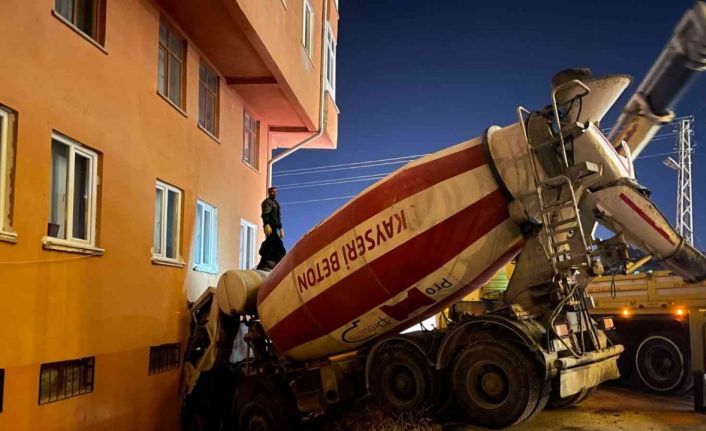 Kayseri’nin Kocasinan ilçesinde park halindeyken freni boşalan beton mikseri binaya çarparak durdu.