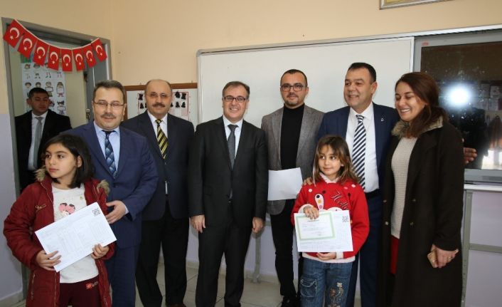 Demokrasi Şehitleri İlkokulu öğrencileri, Kaymakam Sezen ve Başkan Özdoğan’ın elinden karne almanın mutluluğunu yaşadı.