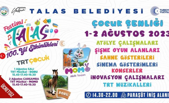 Talas Belediyesinin ’Festival Talas 100. Yıl Etkinlikleri’ çerçevesinde düzenleyeceği Çocuk Şenliği yarın (1 Ağustos Salı) başlıyor.