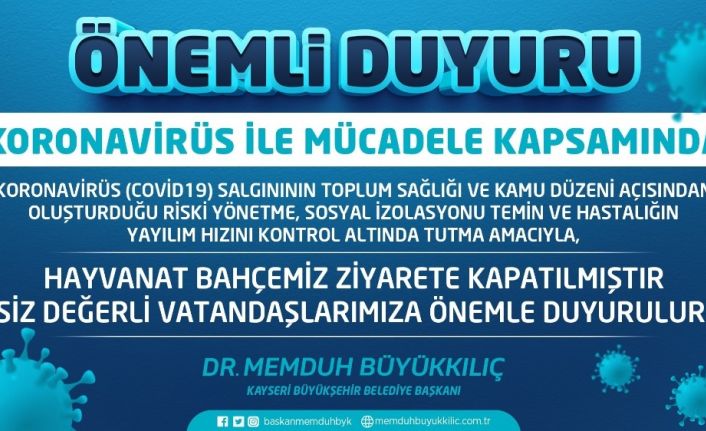 Kayseri Büyükşehir Belediyesi Anadolu Harikalar Diyarı Hayvanat Bahçesi, İçişleri Bakanlığı genelgesi doğrultusunda ziyarete kapatıldı.