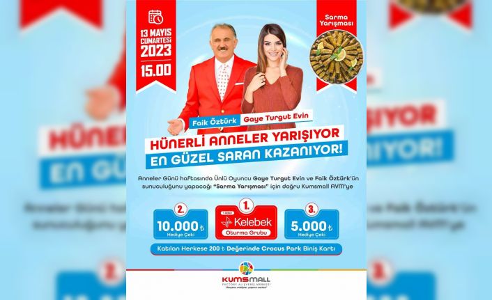 Türkiye ve Avrupa’nın en büyük karma AVM’si olan KUMSMALL AVM, Anneler Günü’ne özel etkinlikte hünerli annelerimizi bir araya getirecek. 13 Mayıs Cumartesi günü yapılacak olan Sarma Yarışması’nın sunuculuğunu Ünlü İsimler Faik Öztürk ve Gaye Turgut Evin üstlenecek.