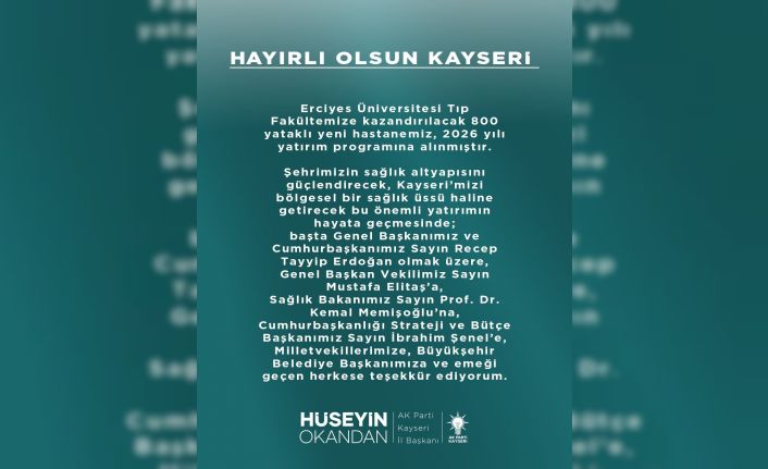 "Hayırlı Olsun Kayseri. Erciyes Üniversitesi Tıp Fakültemize kazandırılacak 800 yataklı yeni hastanemiz, 2026 yılı yatırım programına alınmıştır. Şehrimizin sağlık altyapısını güçlendirecek, Kayseri’mizi bölgesel bir sağlık üssü haline getirecek bu önemli yatırımın hayata geçmesinde; başta Genel Başkanımız ve Cumhurbaşkanımız Sayın Recep Tayyip Erdoğan olmak üzere, Genel Başkan Vekilimiz Sayın Mustafa Elitaş’a, Sağlık Bakanımız Sayın Prof. Dr. Kemal Memişoğlu’na, Cumhurbaşkanlığı Strateji ve Bütçe Başkanımız Sayın İbrahim Şenel’e, Milletvekillerimize, Büyükşehir Belediye Başkanımıza ve emeği geçen herkese teşekkür ediyorum."
