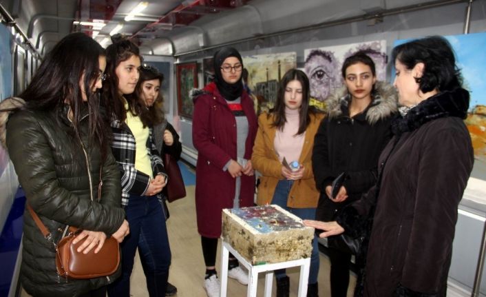 İşgal altındaki Karabağ’da Ermenilerin zarar verdiği Türk eserlerine ait fotoğraf karelerinden yola çıkılarak yapılan tabloların bulunduğu ’Karabağ’da Talan var, Hocalı’da Soykırım’ sergisinin yer aldığı vagon Kayserili misafirlerini ağırlıyor.