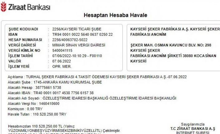 Kayseri Şeker tarafından, Turhal Şeker Fabrikası’nın son ödeme taksiti ile ilgili açıklama yapılarak, son taksit ödemesine dair banka dekontu paylaşıldı.