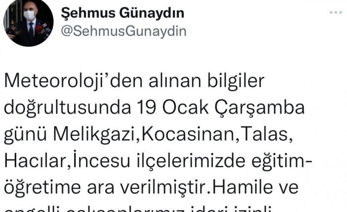 “Meteoroloji’den alınan bilgiler doğrultusunda 19 Oak Çarşamba günü Melikgazi,Kocasinan, Talas, Hacılar,İncesu ilçelerimizde eğitim öğretime ara verilmiştir.Hamile ve engelli vatandaşlarımız idari izinli sayılacaktır. Diğer ilçelerimizde Kaymakamlıklarca değerlendirme yapılacaktır.”