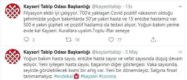 Kayseri Tabip Odası Başkanlığı tarafından twitter hesabından yapılan açıklamada, "Filyasyon ekibi iyi çalışıyor. 700’e yaklaşan Covid pozitif vakasının olduğu şehrimizde yoğun bakımlarda 50’ye yakın hasta ve 15 entübe hastamız var" ifadesinde bulunuldu.