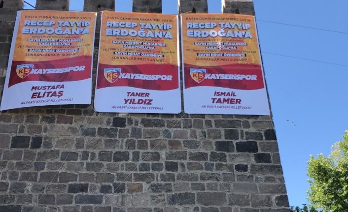 Milli Savunma Bakanı Hulusi Akar, AK Parti Genel Başkan Yardımcısı Mehmet Özhaseki, Kayseri Büyükşehir Belediye Başkanı Memduh Büyükkılıç, AK Parti Kayseri Milletvekilleri Mustafa Elitaş, Taner Yıldız ve İsmail Tamer imzası taşıyan pankartlarda Cumhurbaşkanı Recep Tayyip Erdoğan, Gençlik Spor Bakanı Mehmet Muharrem Kasapoğlu ve TFF Başkanı Nihat Özdemir’e şükran edildi sunuldu.