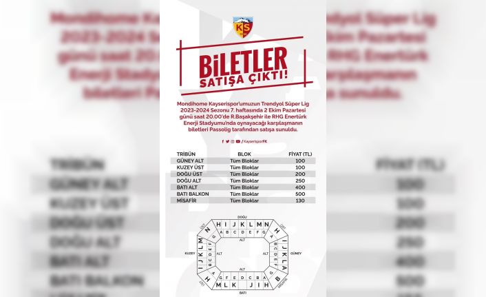 Süper Lig’in 7. haftasında oynanacak Kayserispor-Başakşehir maçının bilet fiyatları belli oldu. Pazartesi oynanacak maçın biletleri, bugünden itibaren satışa sunuldu.