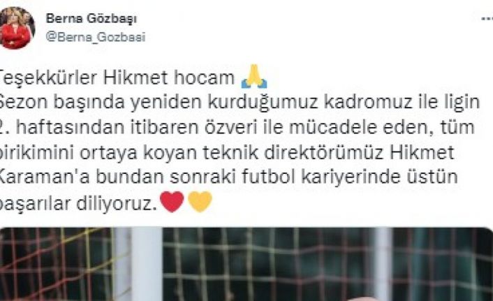 Kayserispor Kulüp Başkanı Berna Gözbaşı, sosyal paylaşım sitesindeki hesabından Teknik Direktör Hikmet Karaman için teşekkür paylaşımı yaptı. Berna Gözbaşı paylaşımında, "Sezon başında yeniden kurduğumuz kadromuz ile ligin 2. haftasından itibaren özveri ile mücadele eden, tüm birikimini ortaya koyan teknik direktörümüz Hikmet Karaman’a bundan sonraki futbol kariyerinde üstün başarılar diliyoruz. Teşekkürler Hikmet hocam" cümleleri kullandı.
