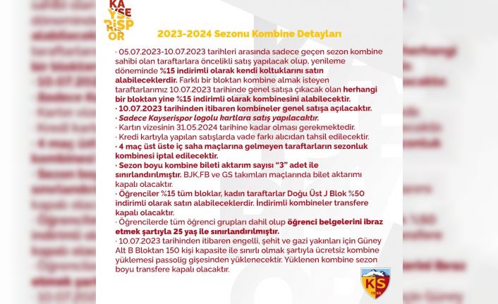Kayserispor Kulübü, Süper Lig 2023-2024 sezonunda geçerli olmak üzere kombine bilet satışının başlayacağını duyurdu. 5-10 Temmuz arası geçen sezon kombine sahibi olan taraftarlara öncelik satış yapılacak. Sarı kırmızılı kulüpten yapılan açıklamada; "Kayserispor’umuzun Süper Lig 2023-2024 sezonunda geçerli olacak kombine satışları 10 Temmuz Pazartesi günü satışa çıkacaktır” ifadelerine yer verildi.
