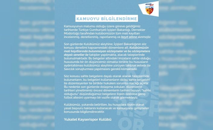 Yukatel Kayserispor Kulübü, yazılı bir açıklama yaparak bazı kişilerin sahte senet ile alacak tahsiline kalkıştığı yönündeki düşünceden ötürü yasal yollara başvurdu.